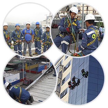 Contrario a la imagen de peligro que aparenta este método de trabajo, el acceso con cuerda es mucho más seguro que cualquier otro sistema de acceso. Revisamos periódicamente todo el material.